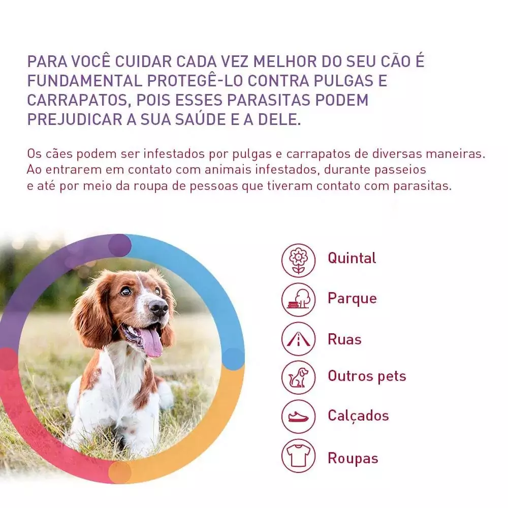 - É uma proteção com longa duração de ação que promove eficácia imediata e persistente por 12 semanas contra pulgas e carrapatos.