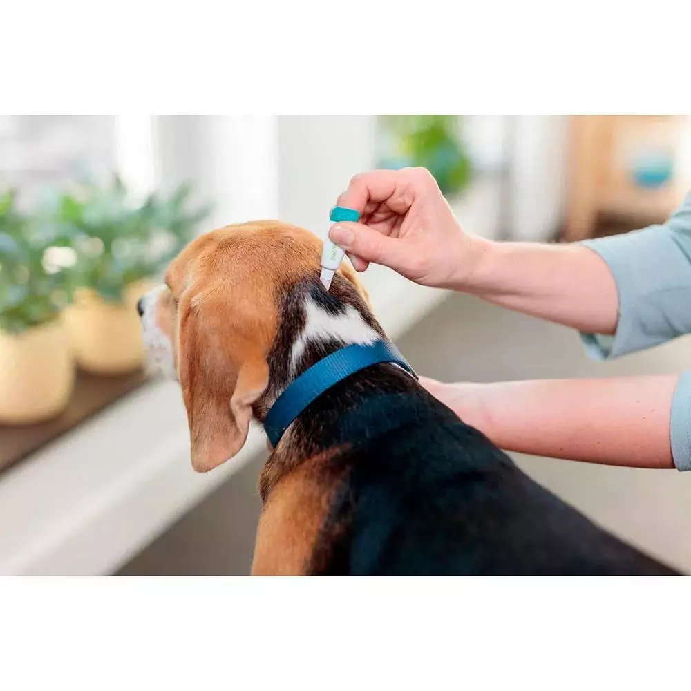 - Apertar a pipeta suavemente e aplicar todo o conteúdo diretamente na pele do cão em um (quando o volume for pequeno) ou vários pontos ao longo da linha dorsal do cão, desde as escápulas até à base da cauda. Evitar a aplicação de quantidade excessiva da solução em um único ponto, uma vez que a solução pode escorrer do local da aplicação.