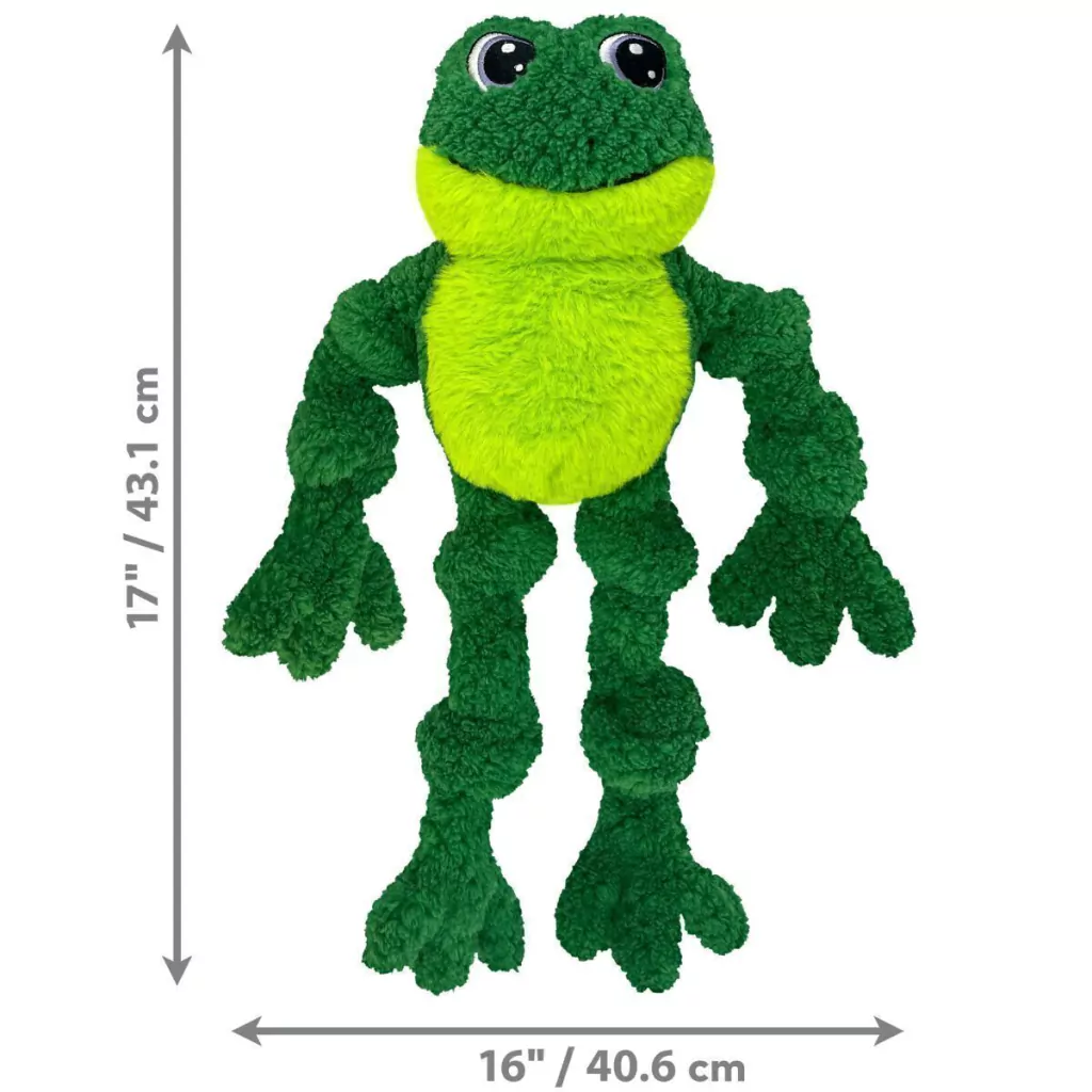 - O Kong Knots Frog são brinquedos de pelúcia para brincar de morder e pegar, com design alegre, flexível e divertido para qualquer cão.