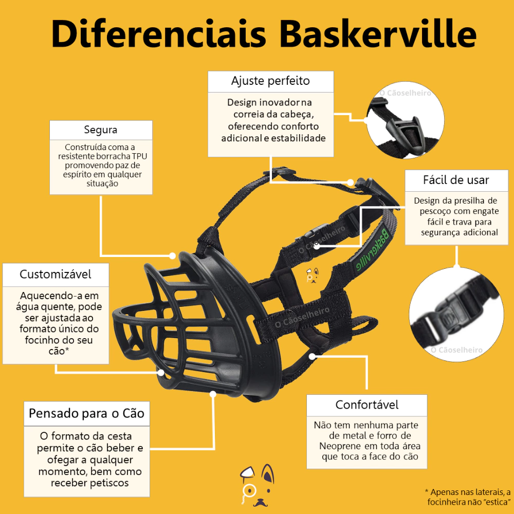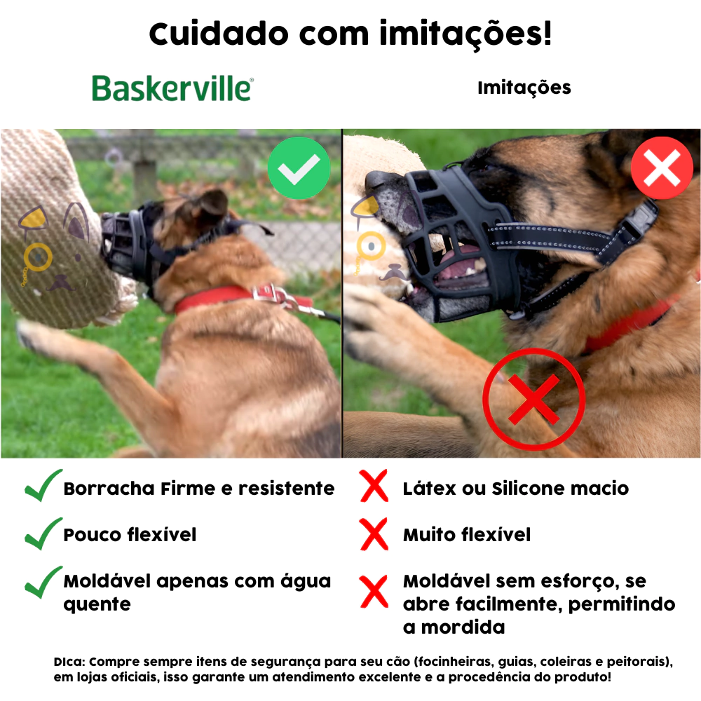 - Macia e Leve: O design da cesta de borracha permite uma proteção total e ainda liberando a boca para beber e ofegar sem dificuldades, sem perder a garantia de proteção contra mordidas. Para a alimentação a focinheira deve ser retirada;