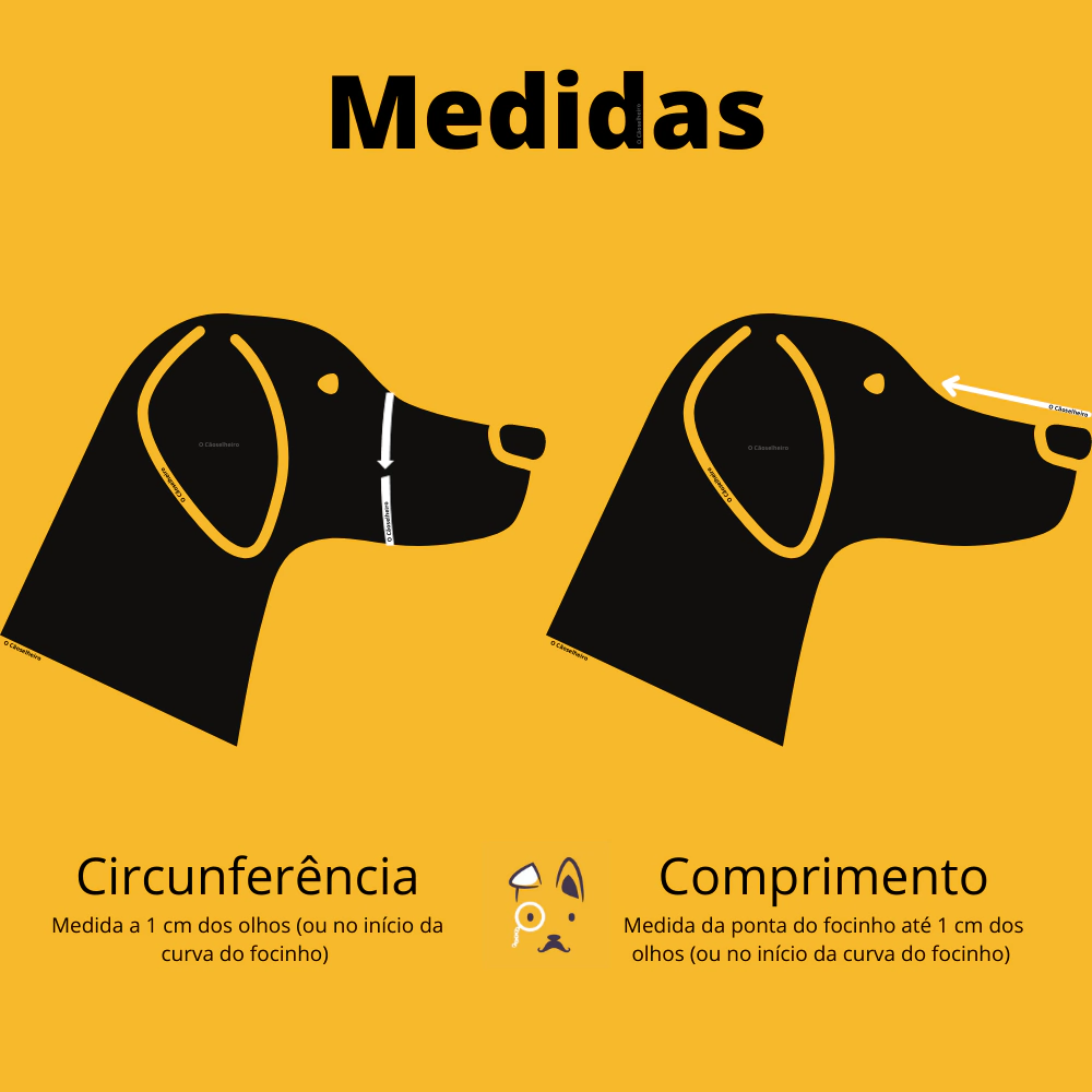 Tire as medidas de seu cão para a escolha correta do tamanho da focinheira, não recomendamos tamanho por raça/peso/idade do cão, pois apenas com as medidas tiradas é possível ter uma ideia do tamanho correto. A focinheira fora do tamanho pode causar desconforto ao cão e/ou representar um risco durante a condução.
