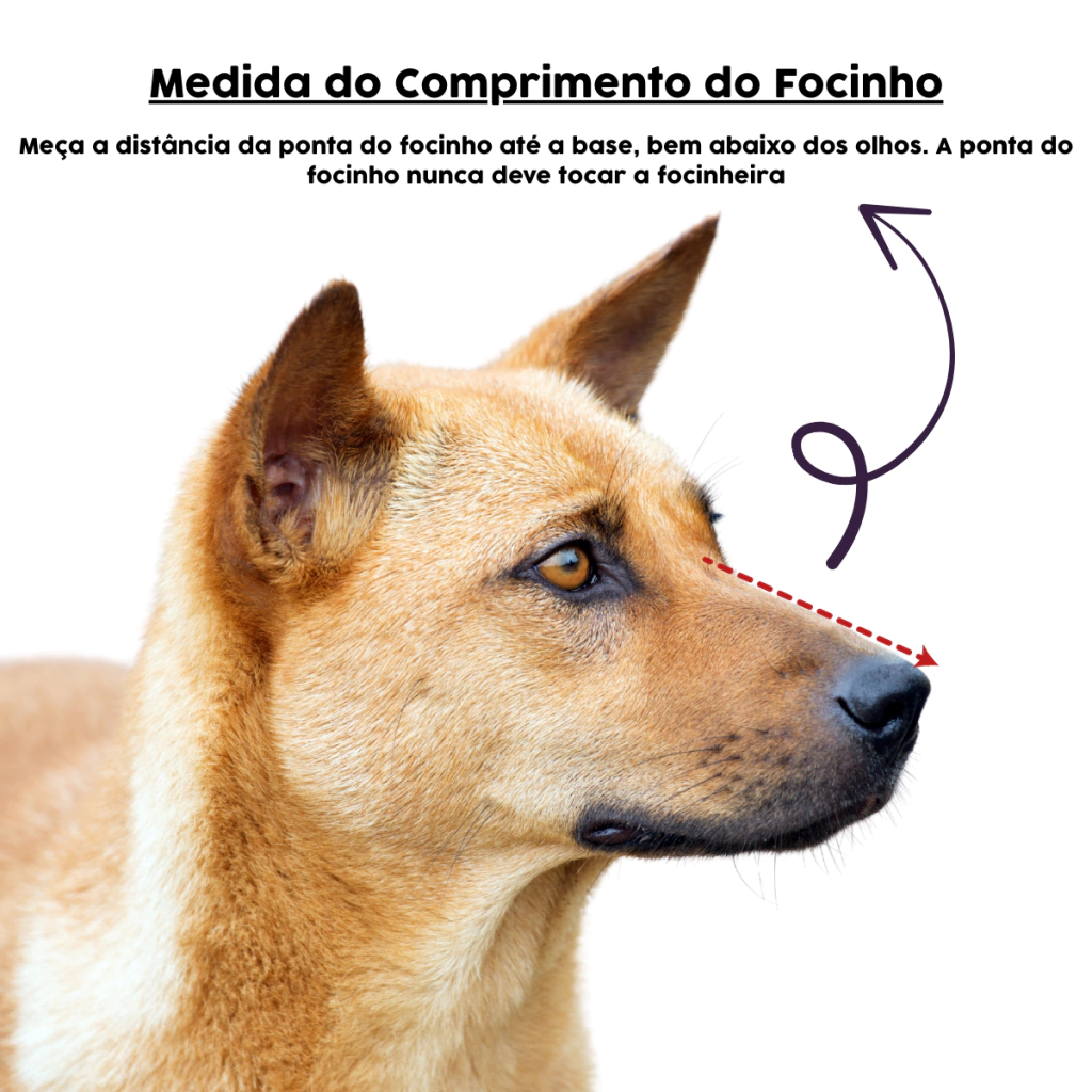 - Medida do comprimento do focinho: meça a distância da ponta do focinho até a base, bem abaixo dos olhos. A ponta do focinho nunca deve tocar a focinheira;