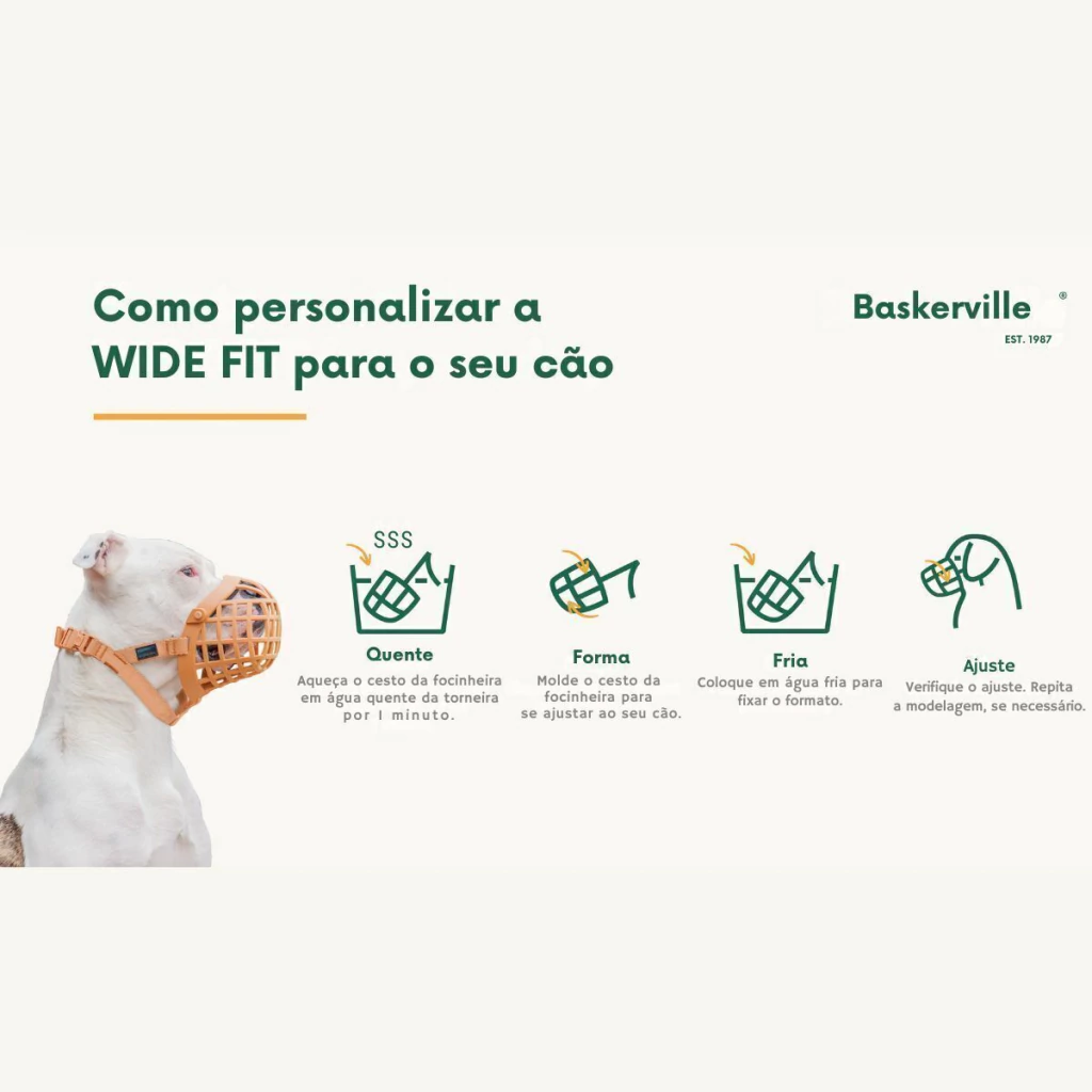- Focinheira moldável: a cesta da Focinheira Baskerville Wide Fit é feita com borracha termoplástica (TPR), o que faz com que ela possa ser remodelada quando colocada em água quente, o que proporciona um modelo exclusivo para cada cão;