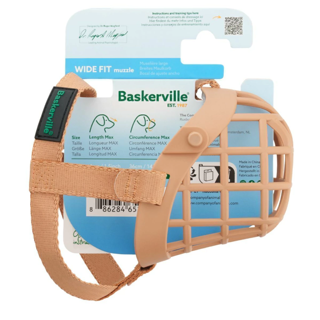 - Projetada com o foco no cão: a Focinheira Baskerville Wide Fit possui um design humanizado, que permite que o cão ofegue, beba, vomite e receba petiscos livremente.