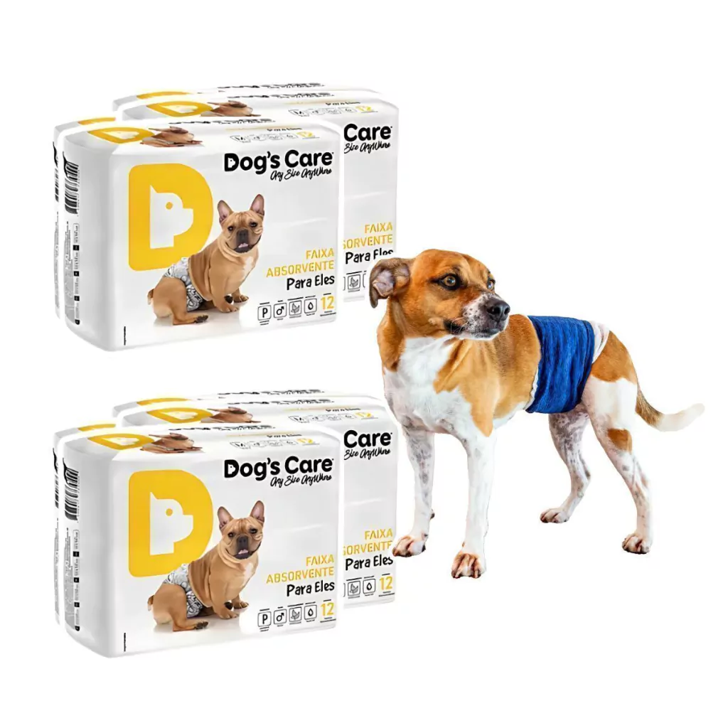 - O Kit contém 4 pacotes tendo 12 faixas absorventes descartáveis da Dog's Care tamanho P em cada pacote e 1 protetor de fralda para cão macho Pet Designer tamanho 2;