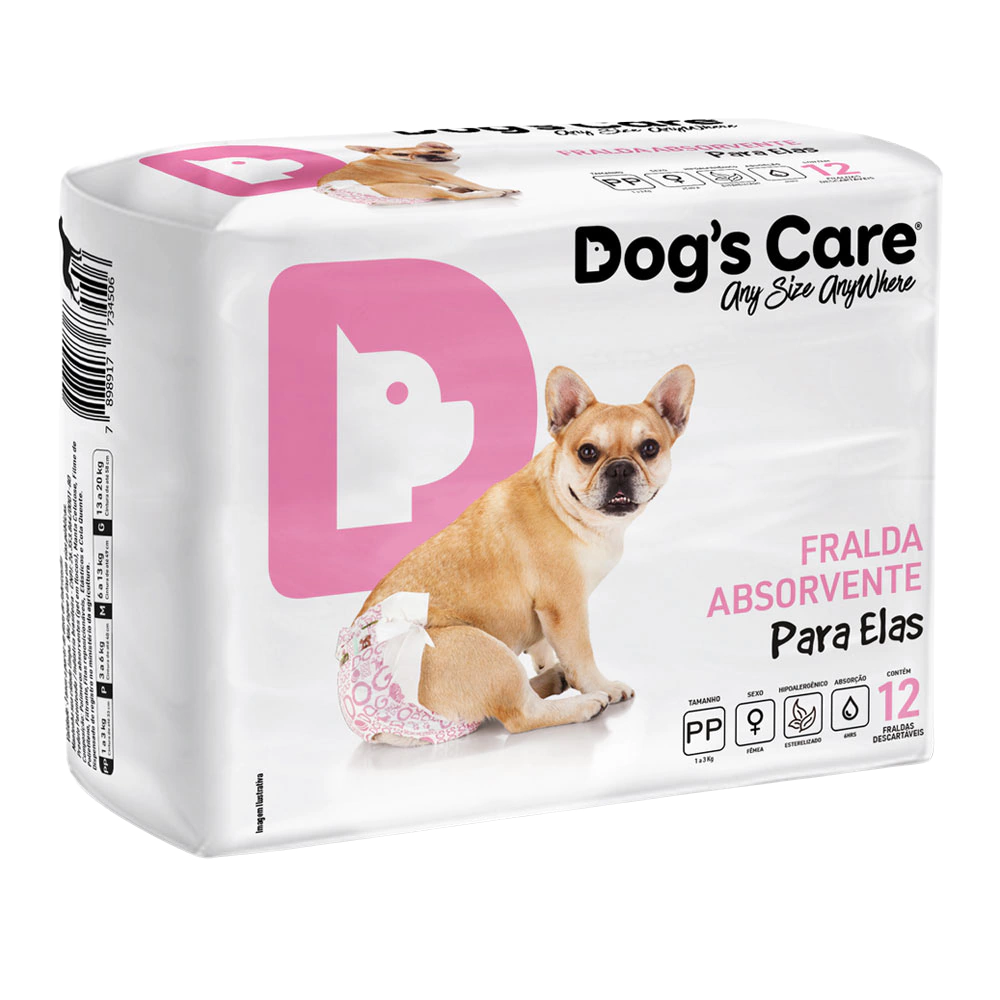 - As Fraldas Dog's Care para Cães Fêmeas possuem formato anatômico de faixa absorvente, manta superabsorvente com gel em flocos que garantem até 6 horas de absorção (depende do fluxo de urina) e fitas velcro reposicionáveis para proporcionar melhor ajuste.