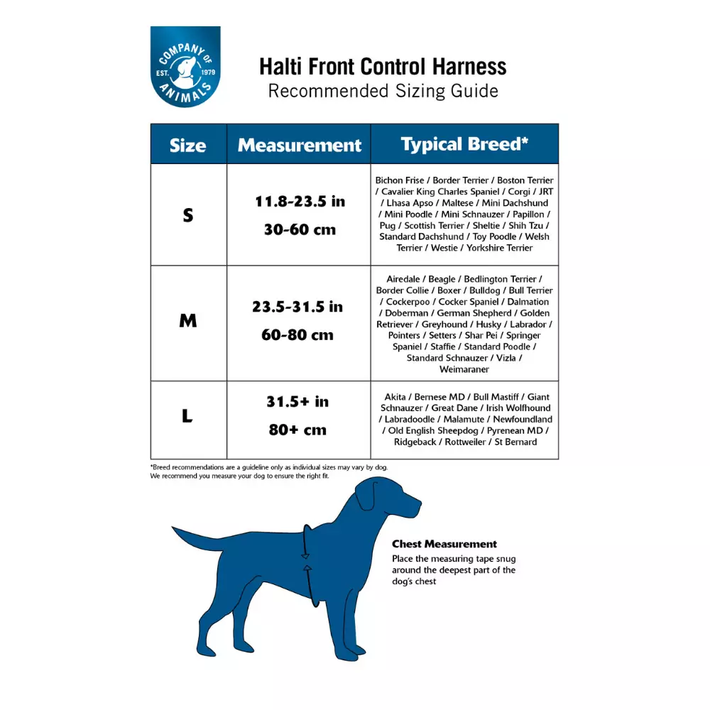 O Peitoral de Controle Frontal da Halti está disponível em 3 tamanhos - P, M e G - adequados para cães com as seguintes medidas de tórax (medida da circunferência entre as costas e a barriga, passando por trás das patas dianteiras):