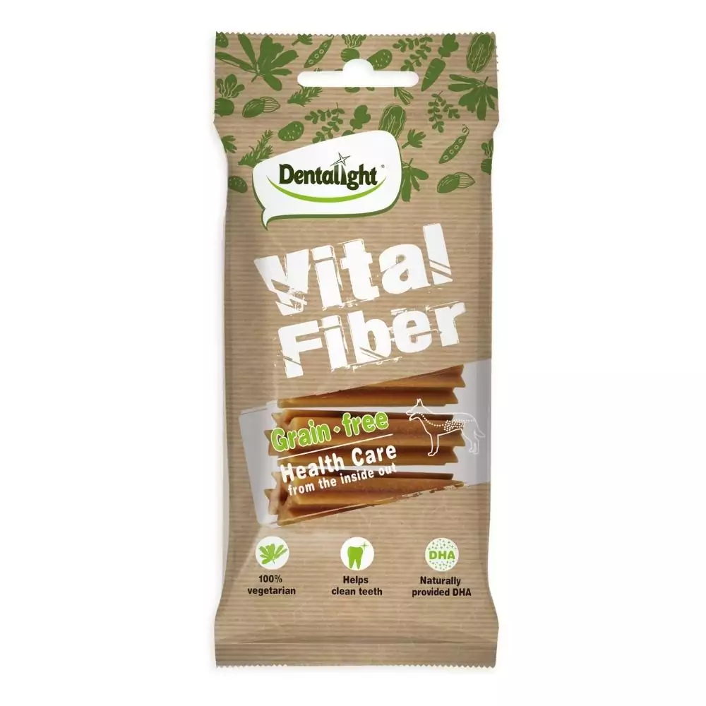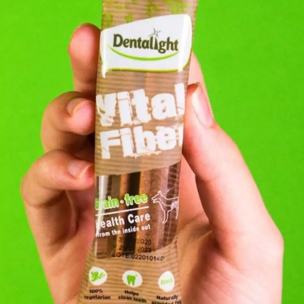 - O Vital Fiber da Dentalight é um petisco natural, saudável e com sabor que os cachorros adoram.