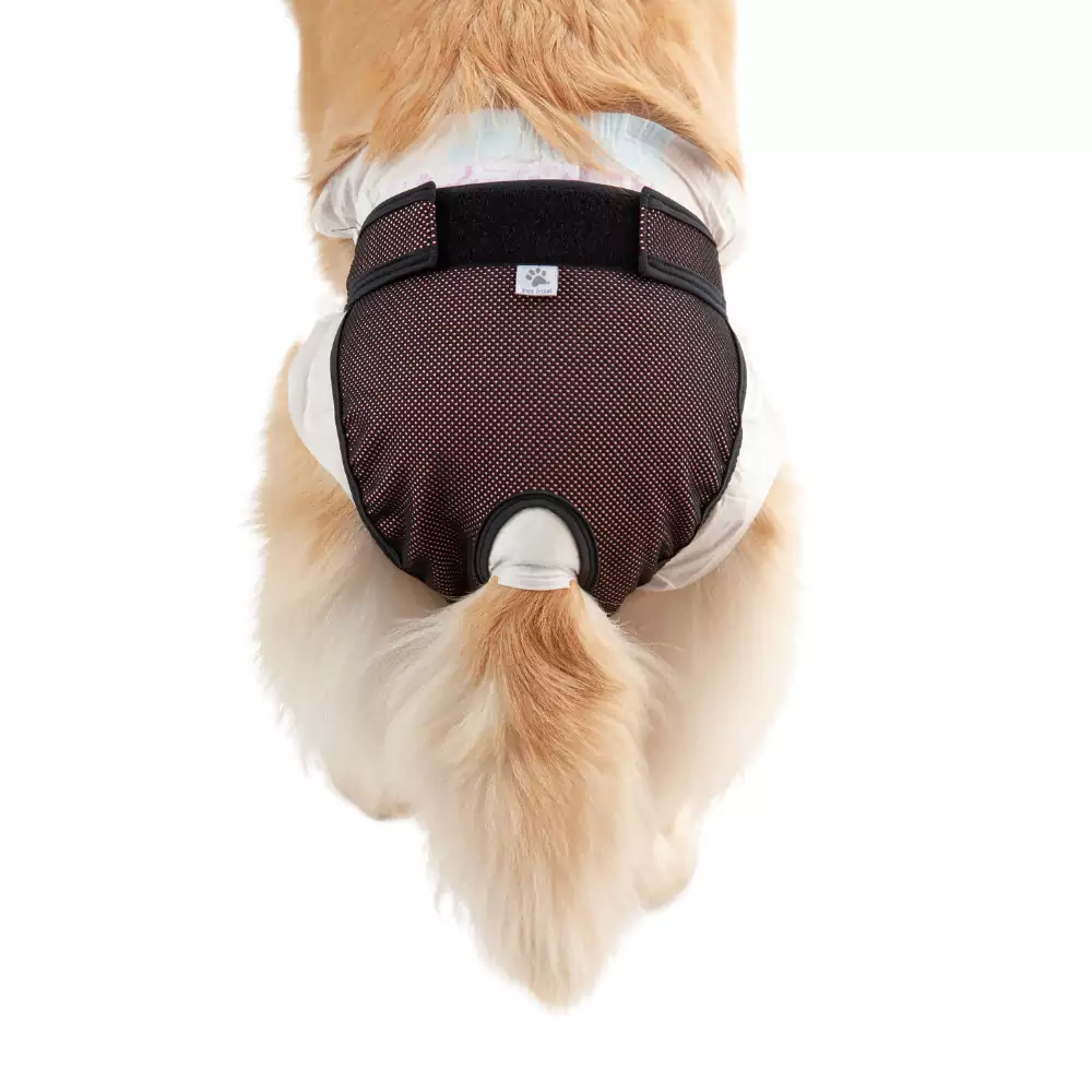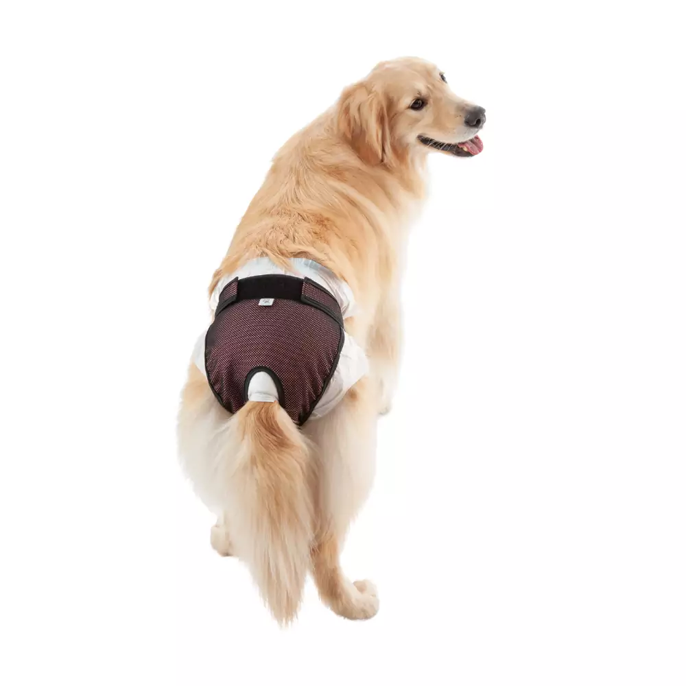 - É confortável e não estressa os cães, além de evitar que a fralda ou absorvente de fluídos escorregue ou sejam removidos, protegendo assim seus móveis, pisos, tapetes e carros de acidentes;