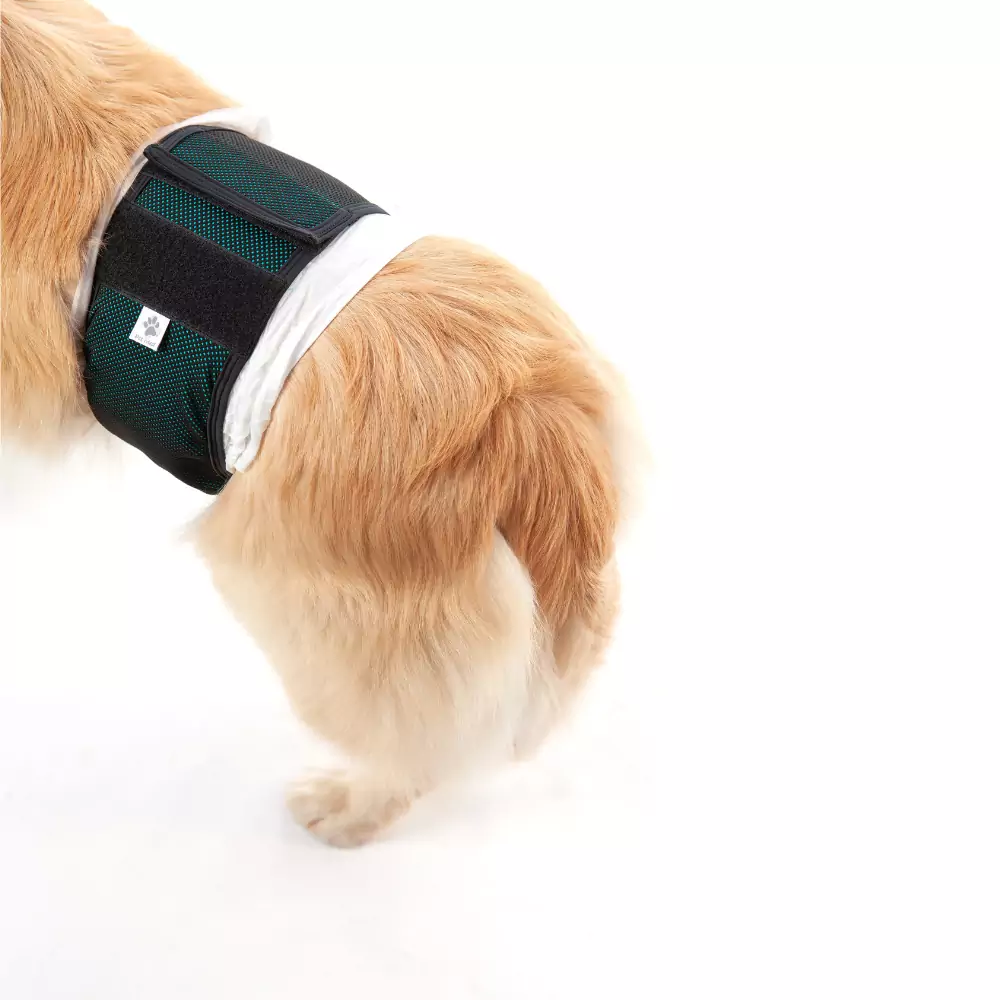 - É confortável e não estressa os cães, além de evitar que a fralda ou absorvente de fluídos escorregue ou sejam removidos, protegendo assim seus móveis, pisos, tapetes e carros de escapes urinários;