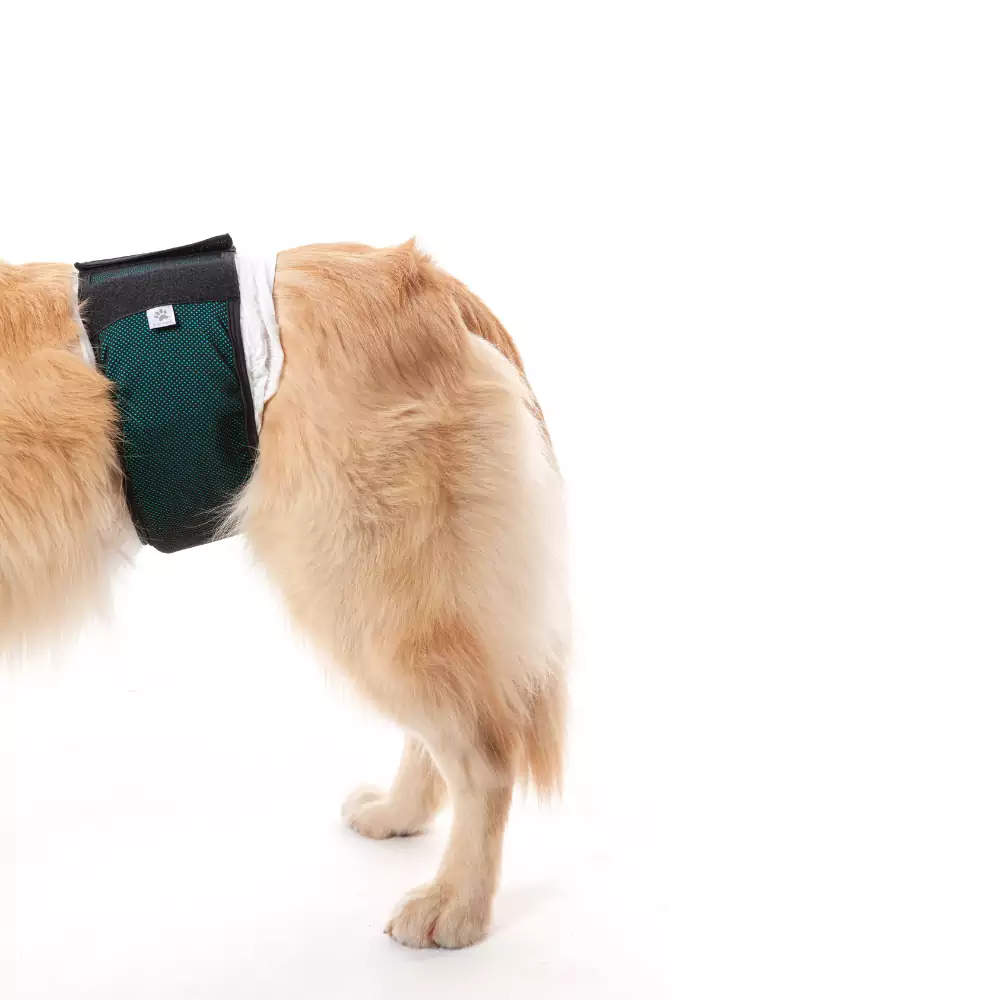 - É confortável e não estressa os cães, além de evitar que a fralda ou absorvente de fluídos escorregue ou sejam removidos, protegendo assim seus móveis, pisos, tapetes e carros de escapes urinários;