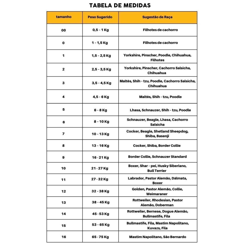 Tamanho - 12 / Peso Aproximado 32 – 38 kg / Sugestão de raças - Golden, Pastor Alemão, Collie, Weimaraner