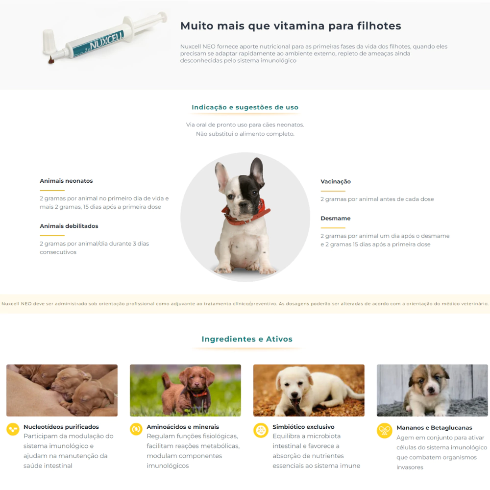 - Nuxcell NEO fornece aporte nutricional para as primeiras fases da vida dos filhotes, quando eles precisam se adaptar rapidamente ao ambiente externo, repleto de ameaças ainda desconhecidas pelo sistema imunológico