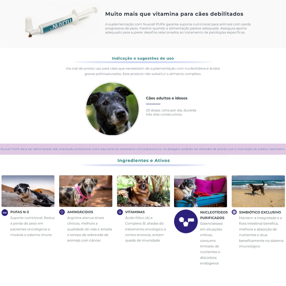 - Nuxcell PUFA garante suporte nutricional para animais com perda progressiva de peso, mesmo quando a alimentação parece adequada. Assegura aporte adequado para superar desafios relacionados ao tratamento de patologias específicas.